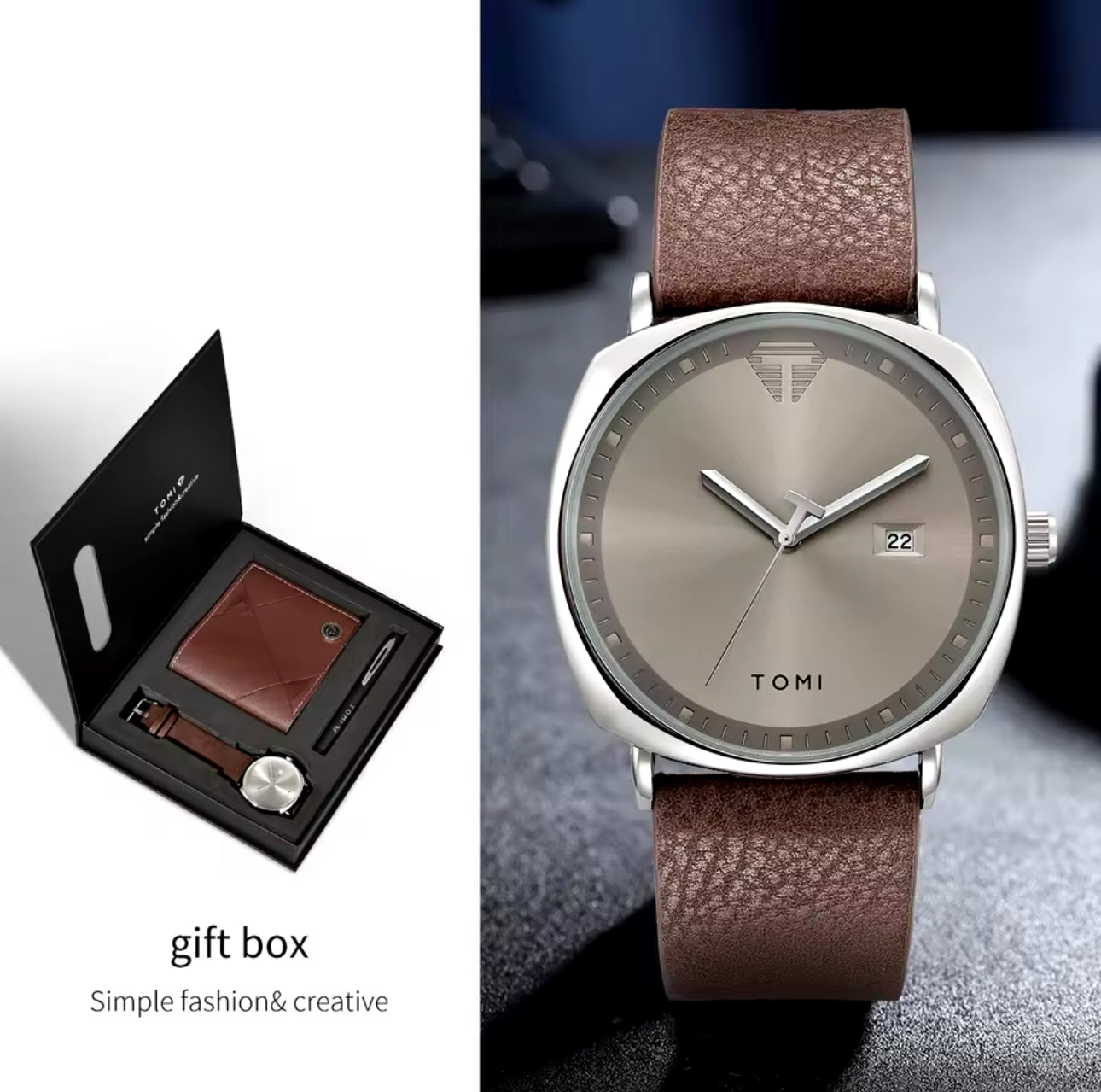 Introducing the Tomi S8 Brown Silver Sleek Gift Set. Designed by industry experts, this gift set includes a sleek dial watch, leather wallet, pen, and watch. Perfect for any occasion, this set offers a complete package of style, functionality, and sophistication. Upgrade your accessory game with this exclusive set.